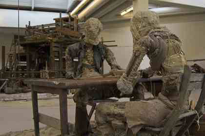 Van twee figuren, die als schaakspelers aan de tafel gezeten zijn, blijken de handen in enkele planken te eindigen. Het is de armatuur, het skelet van het beeld. Eigenlijk zijn het hun blote botten, want het vlees van Izaak Zwartjes, dat is zijn sculptuur. Hij is een typische beeldhouwer, één die zijn ‘eigen’ materie heeft ontwikkeld. Zoals God een eigen creatie heeft geschapen, zo maakt de beeldhouwer zijn eigen materie, een gortig grijze, gedroogde drab van vuil en papier maché. De ware kunstenmaker dus. En in het geval van Izaak Zwartjes één die de golven, die stukslaan op de de rock van sentiment en grootse thema’s, niet schuwt.