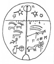 De tekening op de trommel van een Siberische shamaan, de trickster, een vroege vorm van de geestenbezweerder of priester. Vaak tonen deze afbeeldingen de onder- en bovenwereld. De verbinding daartussen of de horizon wordt uitgebeeld door een grote, staande figuur. Hier zou ook gewoon een landschap zichtbaar kunnen zijn, met sterren in de lucht en dieren op de aarde. In het klein herhaald de tekening zich echter links beneden, een kleine figuur heeft een trommel in zijn hand. Hier ontstaat het Droste-effect. De shamaan zelf is de verbinding tussen de geest en het lichaam, in trance reist de medicijnman tussen de verschillende werelden van leven en dood.