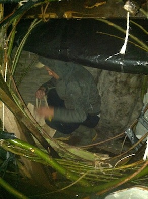 De opbouw van het Nest verliep weliswaar voorspoedig, een drie dimensionele basis van houten balken (zie foto) werd verankerd in de muur om daarna met een grote hoeveelheid wilgentenen, houten latten, plastic zeil en draadmetaal een nest te vormen, door elkaar heen gevlochten zoals een vogel bouwt met restmaterialen. Maar de herfst was de avond van de 10e september 2013 hevig in haar aanvang en het stormde. Kameraad en handlanger Paul Bouter rapporteerde mij de volgende middag.
