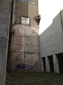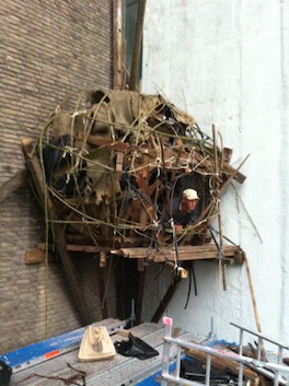FB pagina ‘t Laatste Oordeel meldt: De Meelfabriek in Leiden, 4 september 2013. In het midden tussen de gebouwen is de steiger te zien, waar bovenop Izaak Zwartjes met hulp van Paul Bouter een Nest aan de wand aan het bouwen is. De beeldhouwer wil drie dagen verblijven op twee-en-twintig meter hoogte, verkleefd aan de muur.